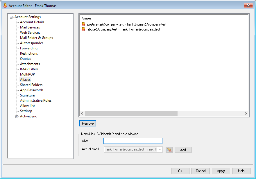 To add a new alias to the account, in the Alias box type the address that you wish to associate with the account and then click Add. The wildcards "?" and "*" are permitted, representing single characters and single words, respectively.