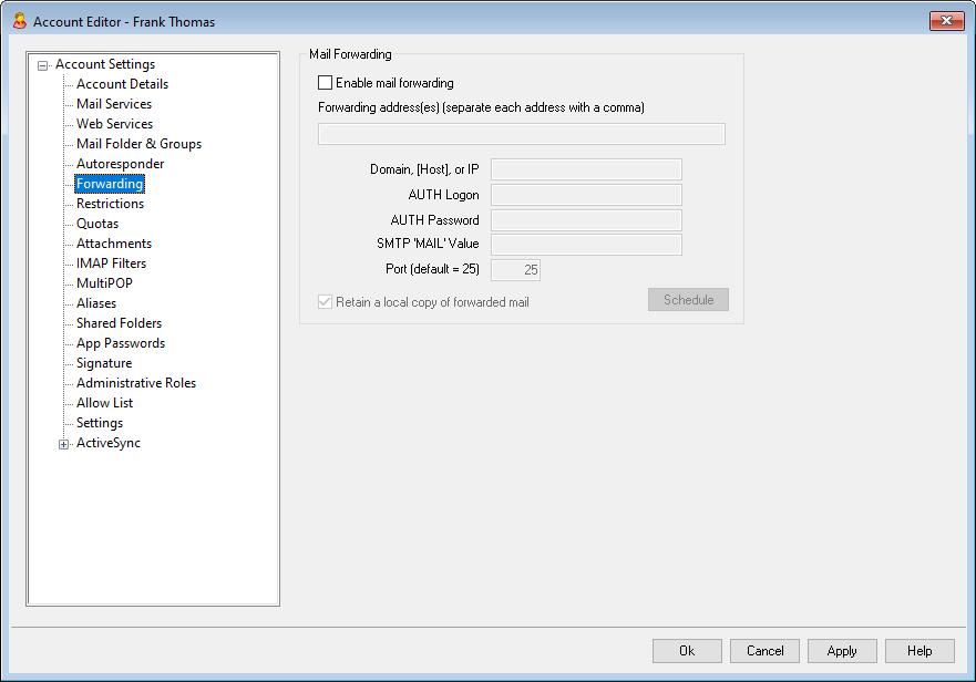 Click this button to create a schedule for when the account's email will be forwarded. You can set a start date and time, an end date and time, and specify the days of the week on which mail will be forwarded.