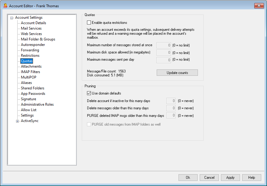 Check this box if you wish to specify a maximum number of messages that the account can store, set a maximum amount of disk space that the account can use (including any file attachments in the account's Documents folder), or designate a maximum number of messages that the account can send via SMTP per day. If a mail delivery is attempted that would exceed the maximum message or disk space limitations, the message will be refused and an appropriate warning message will be placed in the user's mailbox. If a MultiPOP collection would exceed the account's maximum a similar warning is issued and the account's MultiPOP entries are automatically switched off (but not removed from the database).