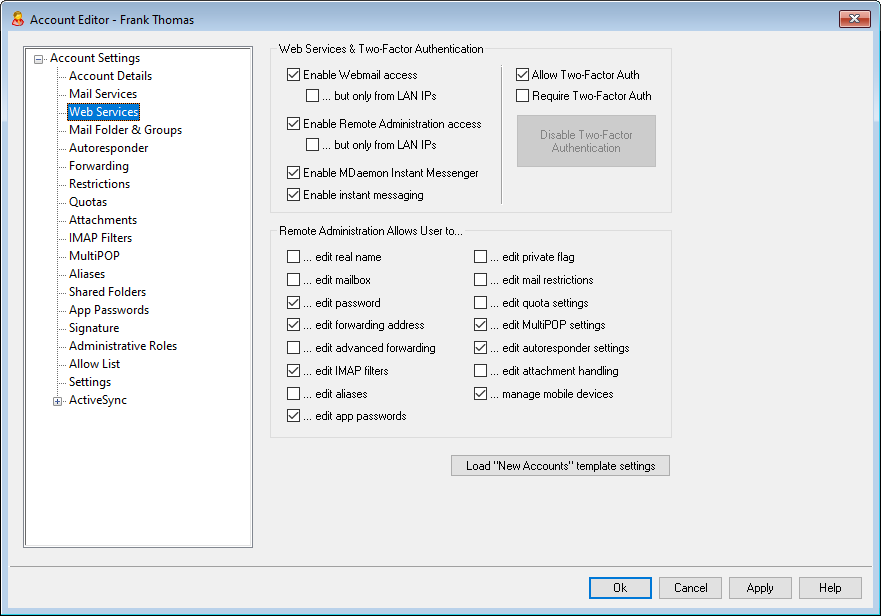 Check this box if you wish to grant the user permission to modify his or her account settings via Remote Administration. The user will only be able to edit those settings that you designate below.