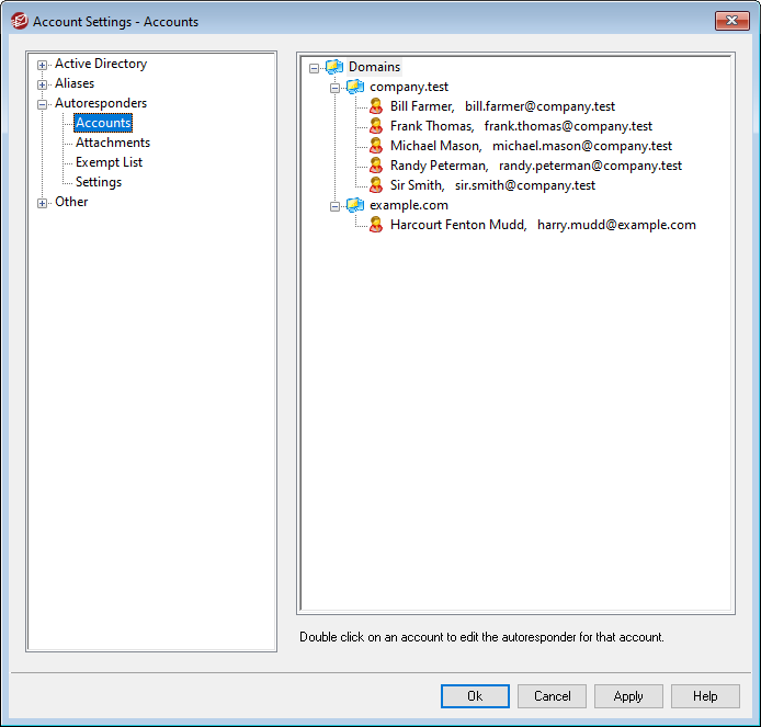 This area lists all available local mailboxes that can host an autoresponder. Double-click an account in this list to open its corresponding Autoresponder screen, which is used to configure an autoresponder for that account.