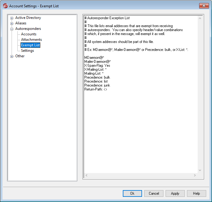 Use Autoresponder » Exempt List to configure global exceptions to autoresponders. Messages from entries in this list will not receive any autoresponders. Both email addresses and header/value pairs can be included in the list. Enter one address or header/value pair per line. Wildcards are permitted.