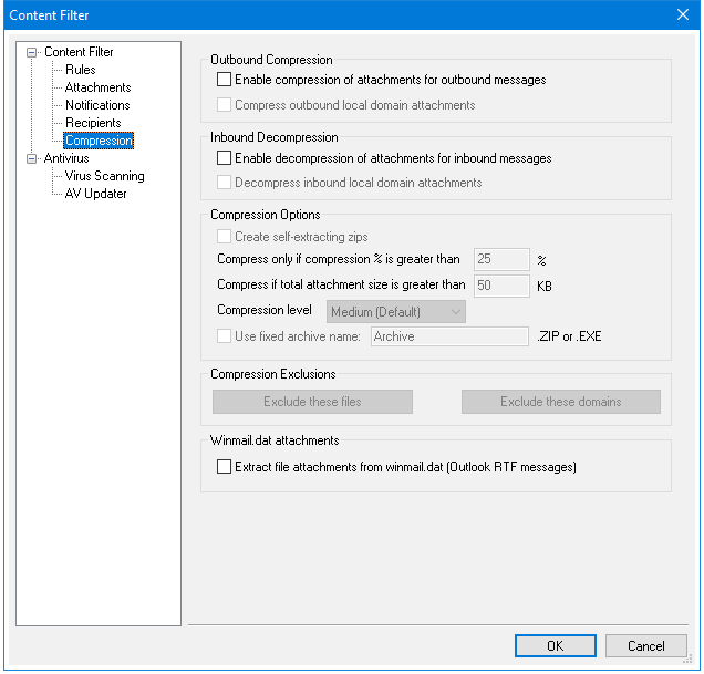 With the controls on this tab you can cause message attachments to be automatically compressed or decompressed before the message is delivered. The level of compression can be controlled as well as several other parameters and exclusions. This feature could significantly reduce the amount of bandwidth and throughput required to deliver your outbound messages.