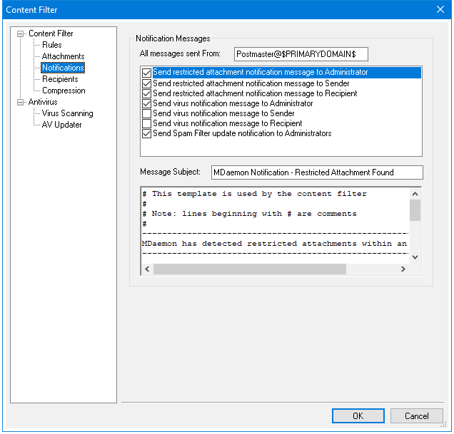 When a message arrives with a file attachment containing a virus, a warning message will be sent to the individuals designated in this section. A customized warning message can be sent to the sender, recipient, and the administrators that you have designated on the Recipients screen. To customize the message for any of the three entries, select one of them from the list and then edit the message that appears on the bottom half of this screen. Each entry has its own message, though by default this isn't obvious since some are identical.