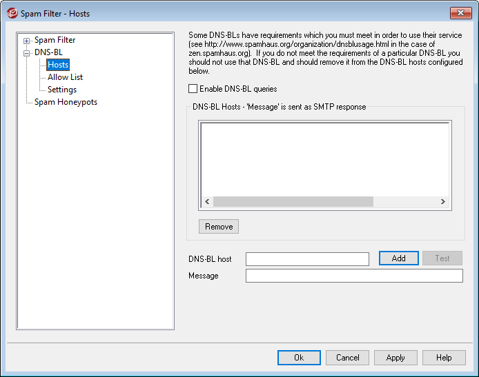 After entering a host and return message, click this button to add it to the DNS-BL hosts list.