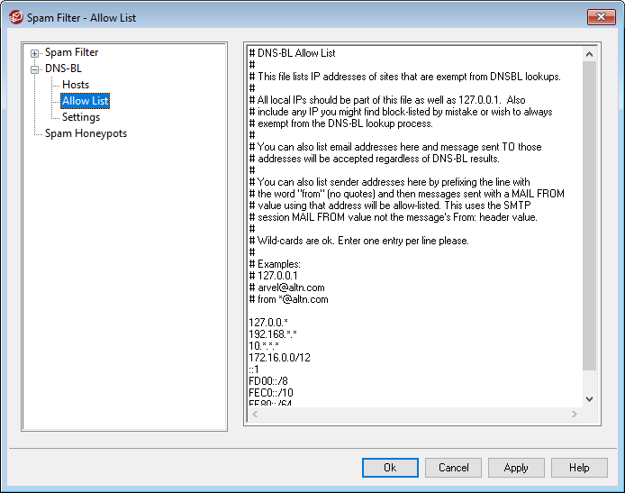 Use this screen to designate IP addresses that will be exempt from DNS Block List queries. You should always include your local IP address range to prevent DNS-BL from looking up messages originating from local users and domains (i.e. 127.0.0.*, 192.168.*.*, and so on). You can also include email addresses on the list. When a message is addressed to one of them then that message will be accepted regardless of the DNS-BL lookups results. Finally, you can also exempt specific senders from DNS-BL results by entering "from sender@example.com" on the list. This address must match the SMTP session's "MAIL FROM" value, not the messages "From:" header.