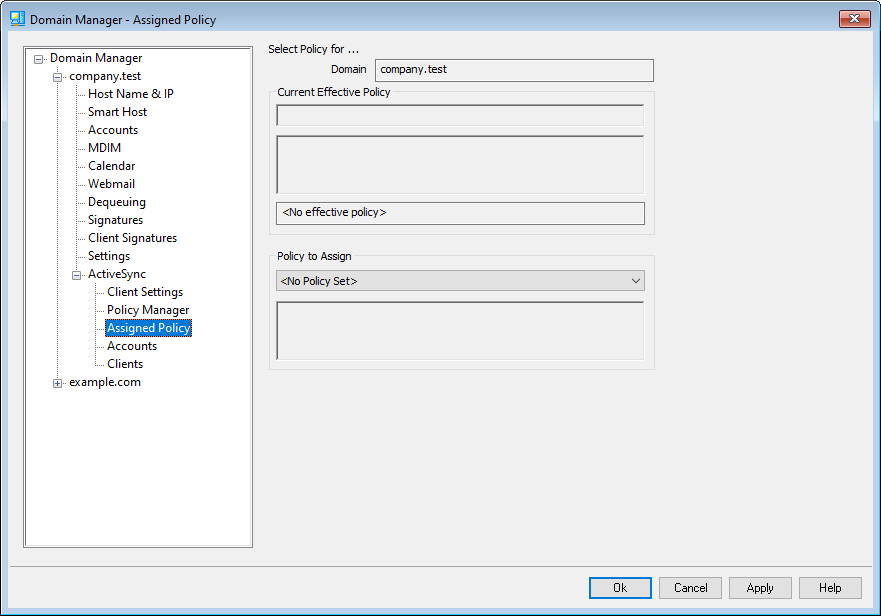 To assign a default ActiveSync policy for the domain, click the Policy to Assign drop-down list, select the desired policy, and click Ok.