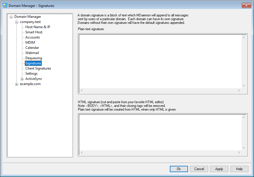 Use this screen to append a signature to all messages sent by this domain's users. If no signature is specified here then the Default Signature will be appended instead. Signatures are added to the bottom of messages, except for mailing list messages using a footer, in which case the footer is added below the signature. You can also use the Account Editor's Signature feature to add individual signatures for each Account. Account signatures are added just before Default or Domain Signatures.