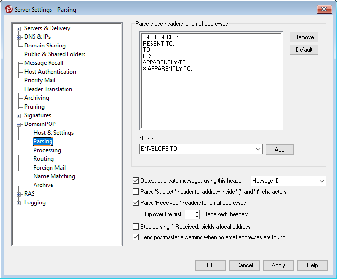 It is possible to store the recipient information ordinarily found only within the message’s envelope in the "Received" message headers. This makes it possible for parsers of the mail message to be able to glean the actual recipient address by merely inspecting the Received headers later. Click this checkbox if you wish to parse valid addresses from all of the "received" headers found within the mail message.