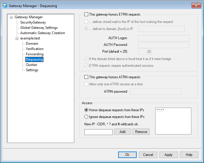 When using ATRN to dequeue this gateway's mail, or when you are requiring authentication via the ETRN dequeuing requires authentication option on the Settings screen, designate the gateway's ATRN password here.
