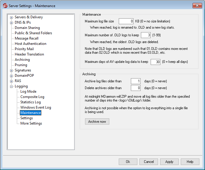 Use this option if you want MDaemon to delete archived log files automatically when their age exceeds the number of days specified here. Use "0" in this option if you do not wish to delete archives automatically. Archive deletion occurs during the daily midnight cleanup event.
