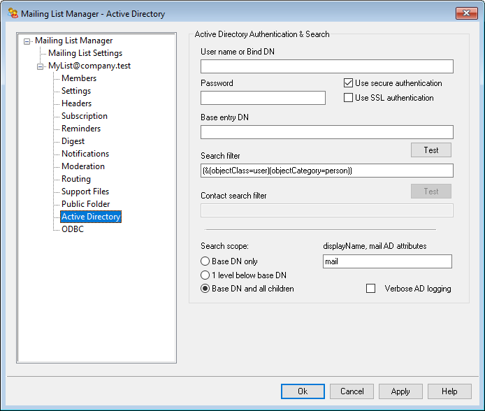 You must use this field to specify the attribute that will contain the email addresses used by this list. For example, if you used "Mail" in this field, then each Active Directory account that you wish to be treated as a list member must have the "Mail" attribute, and that attribute must contain an email address. You can additionally enter an Active Directory attribute for the full name field of list members before the email address attribute, separated by a comma. For example, you could enter: "displayName, mail" rather than just "mail" in this option. The first is the Active Directory attribute where the full name resides, and the second is the email attribute.