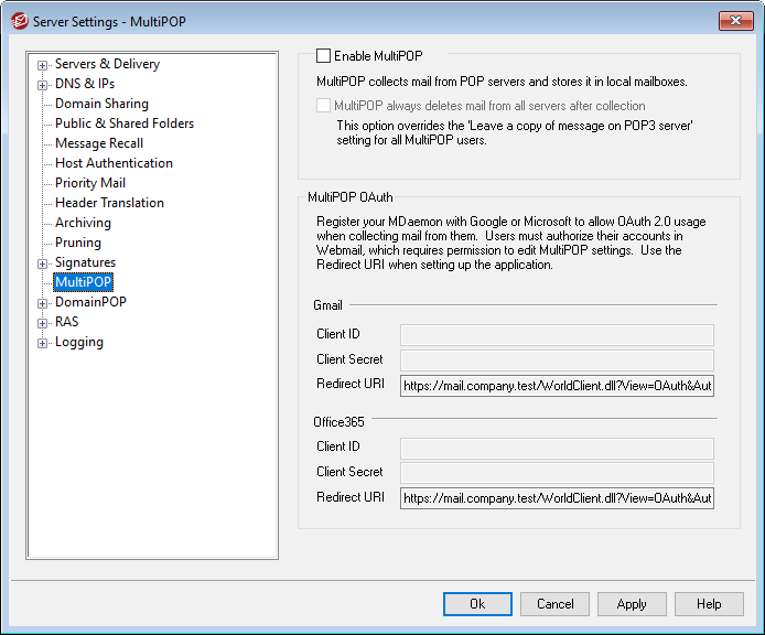 You must specify a Redirect URI when creating your OAuth 2.0 app for Gmail or Office 365. The Redirect URI displayed on the MultiPOP screen is an example built from your Default Domain's SMTP host name, which should work for that domain's users when signing in to Webmail. You should add additional Redirect URIs to your app for any additional MDaemon domains your users go to when signing in to Webmail. For example, "https://mail.example.com/WorldClient.dll?View=OAuth&AuthRequest=Office365" would work for any of your users who go to mail.example.com when signing in to Webmail. See: Creating and Linking Your MultiPOP OAuth App below for more information.