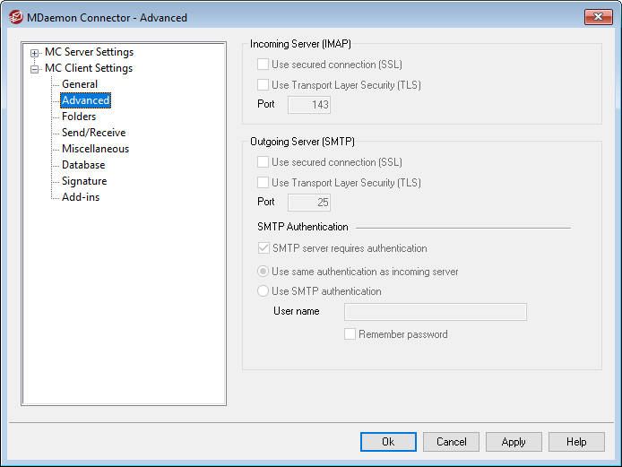 When you have enabled the "Push client settings to MC users" option on the MC Client Settings screen, the settings on this screen will be pushed to the corresponding screen in the MDaemon Connector client whenever an MDaemon Connector user connects to the server. The MC Client Settings are only sent to clients when one of the settings has changed since the last time the client connected and received them.