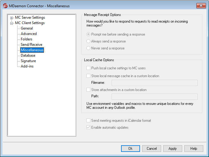 By default MDaemon does not push these settings to the MDaemon Connector client. Check this box if you do wish to push them there. The MC client will move the local files from their current location to the default location, or to a custom location if you specify one in the custom options below.