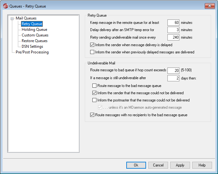 By default MDaemon will inform the sender when a message could not be delivered due to some temporary error, causing it to be placed in the retry queue. Uncheck this box if you do not wish to inform the sender of the delay.