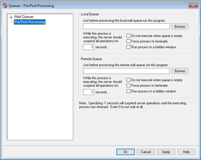 The value entered here determines how MDaemon will behave while the specified program is in progress. MDaemon can be configured to pause its execution thread for the number of seconds specified while waiting for the process thread to return. If the process returns before the number of seconds has elapsed, MDaemon will resume its execution thread immediately. If you enter "0" in this option MDaemon will not suspend operations at all. Entering "-1" will cause MDaemon to wait until the process returns, no matter how long that might be.