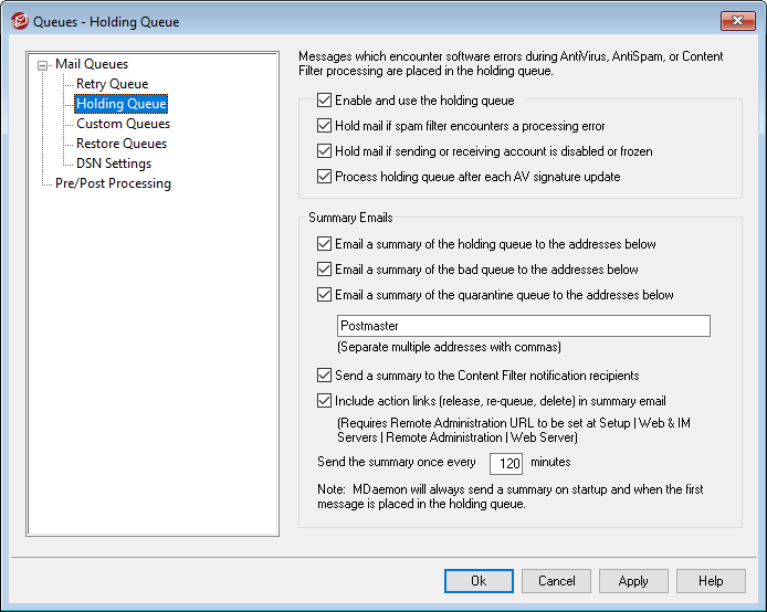 If you wish to send a summary of messages contained in the holding queue to one or more email addresses at regular intervals then click this option and list the addresses in the text space provided below.