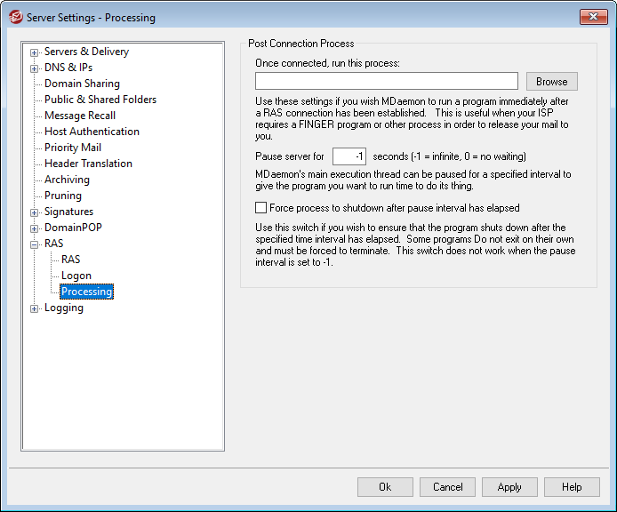 Sometimes the program you need to run may not exit once it has run its course; some programs require user intervention in order to close them down. This is not acceptable when the software must run unattended. If this switch is selected MDaemon will force the process thread to terminate once the number of seconds specified in Pause Server For XX Seconds has elapsed. This function does not work when the server is configured to wait indefinitely for the process to return.