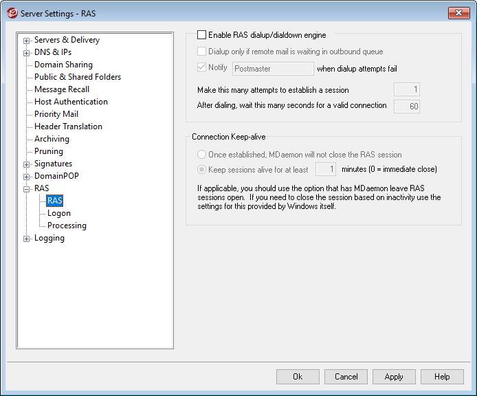 Once established, MDaemon will not close the RAS session