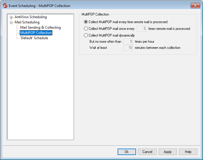 Choose this option if you wish to collect MultiPOP messages dynamically. Ordinarily, MultiPOP is collected for all users at the same time at each remote mail processing interval, or at every x number of intervals. When collected dynamically, MultiPOP messages are collected for each individual user when that user checks his or her local mail via POP, IMAP, or Webmail rather than for all users at once. However, because MultiPOP collection is triggered by a user checking his email, any new MultiPOP messages collected will not be visible to the user until he checks his mail again. Thus, he would need to check his mail twice in order to see new MultiPOP messages. The first time to trigger MultiPOP and a second time to see the mail that was collected.