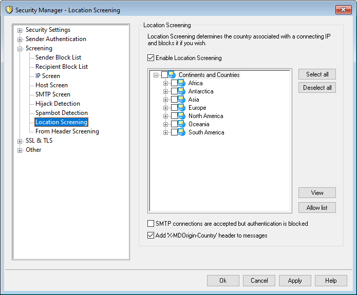 Location Screening is on by default, but no regions or countries are blocked; MDaemon just logs the connecting country or region. To block a location, click the box next to any regions or countries that you wish to block, and click Ok or Apply. When Location Screening is on, regardless of whether or not any locations are being blocked, MDaemon will insert the "X-MDOrigin-Country" header into messages, for content filtering or other purposes. This header contains two-letter ISO 3166 country and continent codes.
