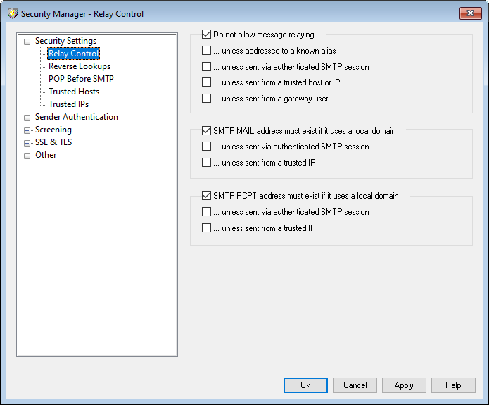 Use Relay Control at Security » Security Settings » Relay Control to define how your server reacts to mail relaying. When a message arrives at your mail server that is neither from nor to a local address, your server is being asked to relay (i.e. deliver) the message on behalf of another server. If you do not want your server to relay mail for unknown users, you can use the settings provided here to control that.