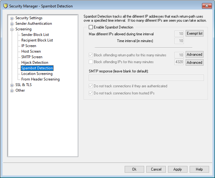 Spambot Detection tracks the IP addresses that every SMTP MAIL (return-path) value uses over a given period of time. If the same return-path is used by an inordinate number of different IP addresses in a short time, this could indicate a spambot network. When a spambot is detected, the current connection is immediately dropped and the return-path value is optionally blocked for a length of time you specify You can also optionally block all the known spambot IP addresses for a designated period.