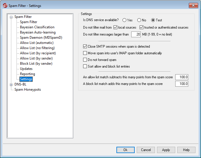 The remaining options on this screen are unavailable when you have configured MDaemon to use another server's MDaemon Spam Daemon (MDSpamD) for Spam Filter processing. See the Spam Daemon screen for more information.
