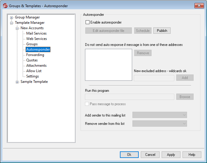 The options on this template screen correspond to the options located on the Account Editor's Autoresponder screen. When a template is set to control this screen, it will control the  Autoresponder options for any account belonging to a Group that utilizes the template.