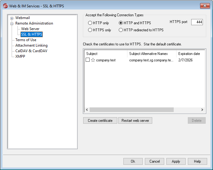 This screen only applies to Remote Administration when using MDaemon's built-in web server. If you configure Remote Administration to use some other web server such as IIS, these options will not be used SSL/HTTPS support will have to be configured using your the other web server's tools.