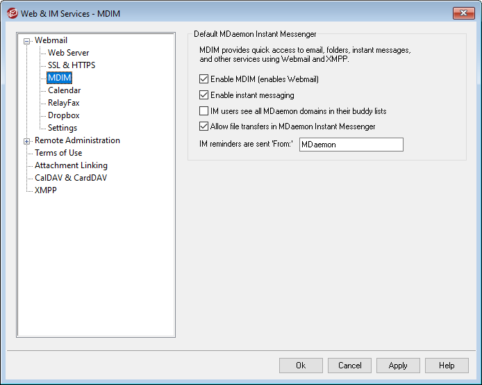 When an appointment is scheduled on a user's Webmail calendar, the event can be set to send a reminder to the user at a specified time. If the IM system is active for the user's domain then the reminder will be sent in an instant message to the user. Use this text box to specify the name that you wish the message to appear to be 'From:'. This is the default setting for new domains. You can change it for specific domains via the Domain Manager's MDaemon Instant Messenger screen.