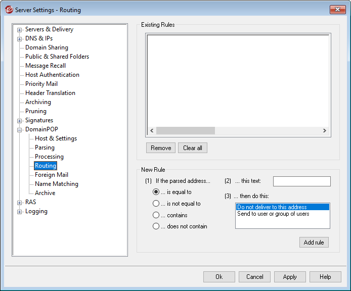 This is the type of comparison that will be made when an address is compared to this routing rule. MDaemon will search each address for the text contained in the "...this text" option below and then proceed based upon this option's setting — does the address's complete text match exactly, not match exactly, contain the text, or not contain it at all?