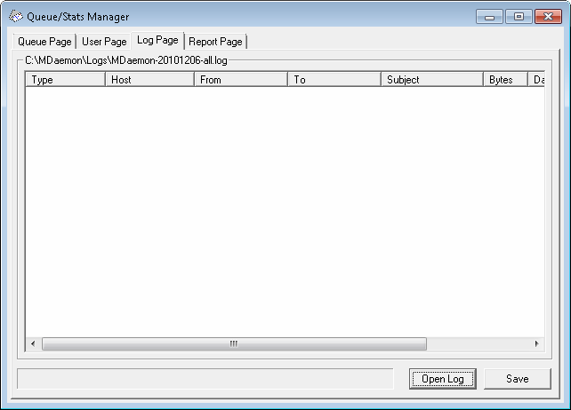 The Log Report list box displays MDaemon's detailed log files that you select through the Open Log button and the Windows Open dialog that follows it. The Log Report display provides a quick and easy way to review the history of mail transactions that MDaemon has processed without having to sort through the large volume of information that MDaemon log files may sometimes contain. When a Log Report is displayed in this list box the Queue and Statistics Manager breaks it down into a simple format containing: the Type of the message (POP Inbound, DomainPOP, RFC2822, and so on), the Host to which MDaemon connected during the transaction, the sender, the recipient, the message size, the date that each message was processed, and whether or not the transaction was successful.