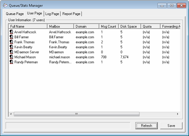 When the User Page is chosen, a list of all MDaemon accounts is loaded into the User Information list box. This list contains each user's full name, the name of their mailbox, the domain to which the account belongs, the number of messages it contains, its mail format, the amount of disk space (in kilobytes) that the account is taking up, their forwarding address, and finally, the date that their mail was last checked. Given that the information contained in this list is constantly changing, it can be easily updated by clicking the Refresh button.