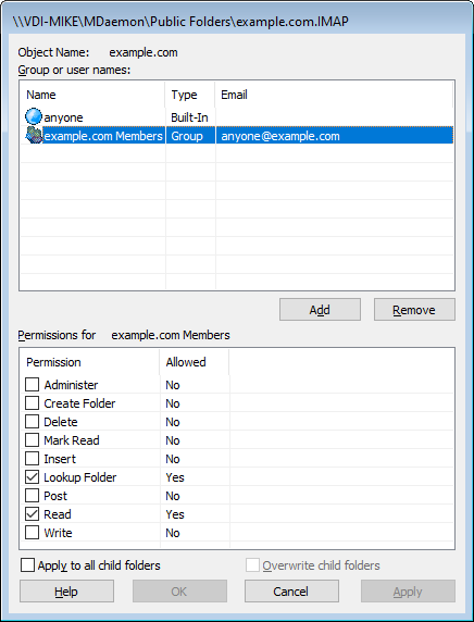Access rights are controlled through MDaemon's support for Access Control Lists (ACL). ACL is an extension to the Internet Message Access Protocol (IMAP4), which makes it possible for you to create an access list for each of your IMAP message folders, thus granting folder access rights to other users who also have accounts on your mail server. If your email client doesn't support ACL you can still set the permissions via the controls on this dialog.