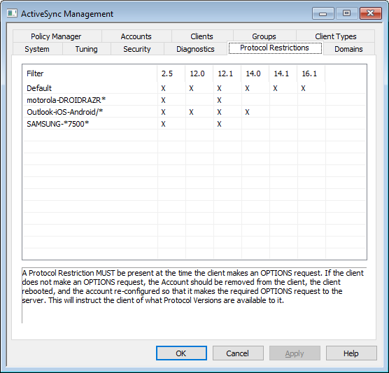 Use the options located under "ActiveSync » Protocol Restrictions" to tell certain clients and devices that they are restricted to specific ActiveSync protocols. This is useful when, for example, a certain type of device is found to have unreliable support for one protocol but reliable support for another. Using the Add/Edit Protocol Restriction dialog, you can define restrictions based on User Agent or Device Type, and restrict the devices to any of the following ActiveSync protocol versions: 2.5, 12.0, 12.1, 14.0, 14.1, and 16.1.