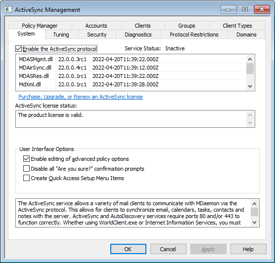 Enable this option if you want the Advanced Settings tab to be visible on the ActiveSync Policy Editor. It contains various advanced policy settings that in most cases will not need to be changed. This option is disabled by default.