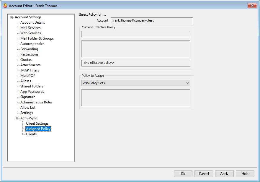To assign a policy to the account, click the Policy to Assign drop-down list, choose the policy, and click Ok or Apply.