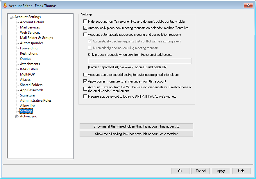 Click this checkbox if you wish to cause automatic processing of meeting requests, changes, and cancellations for this account. When the account receives a message that contains a meeting request, the account’s calendar will be updated automatically. This option is disabled for all accounts by default.