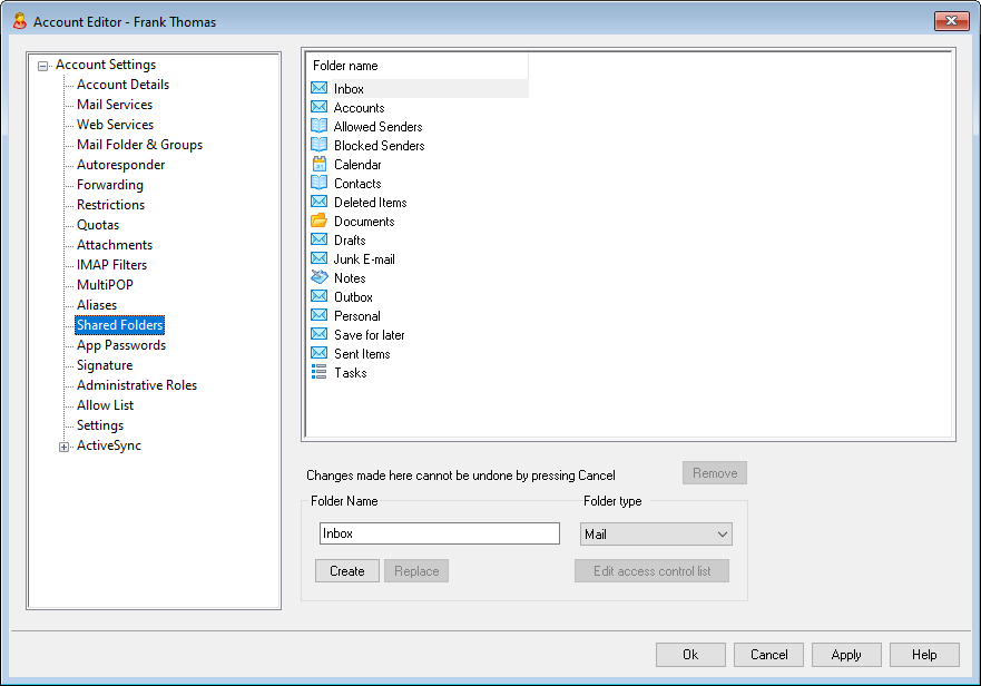 This top section displays all of the user’s IMAP Folders and can be used to share access to them with other MDaemon users or Groups. When the account is first created, this area will only have the Inbox listed until you use the Folder name and Create options (or the options on IMAP Filters) to add folders to it. Subfolders in this list will have the folder and subfolder names separated by a slash.