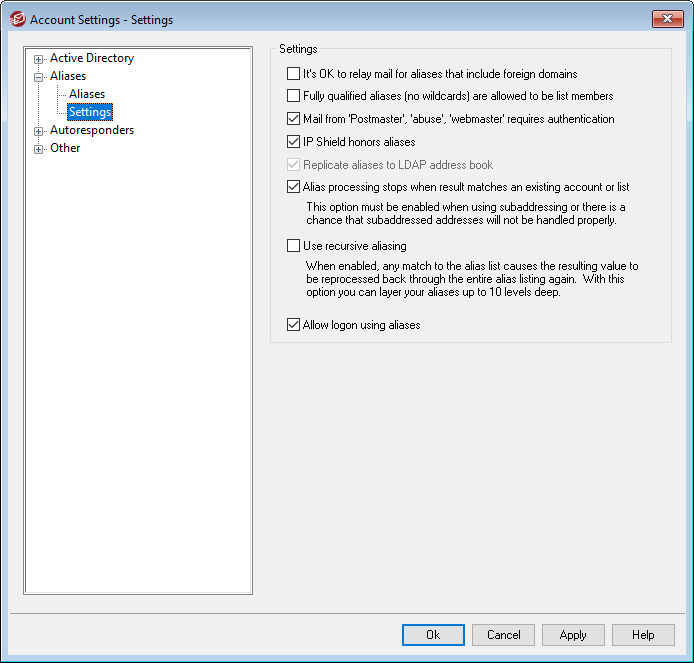 Click this check box if you want aliases to be replicated to the LDAP address book. Alias replication is necessary for the LDAP remote verification feature to work reliably, but if you are not using that feature then replicating aliases to the LDAP address book is unnecessary. If you are not using remote verification then you can safely disable this feature to save processing time. For more information on remote LDAP verification, see: LDAP.