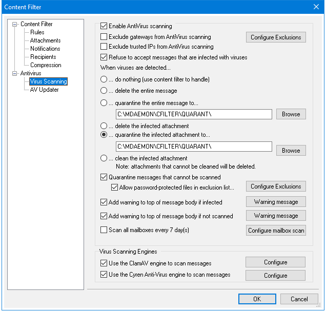 Check this box if you wish to scan all stored messages periodically, to detect any infected message that may have passed through the system before a virus definition update was available to catch it. Infected messages will be moved to the quarantine folder and have the X-MDBadQueue-Reason header added, so that you can see an explanation when viewed in MDaemon. Messages that cannot be scanned will not be quarantined.