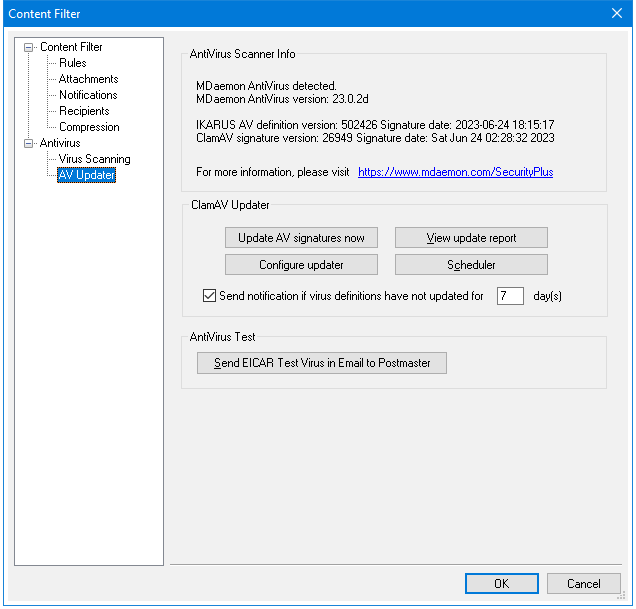 By default the administrator will be notified if the ClamAV virus definitions have not been updated for the specified number of days.