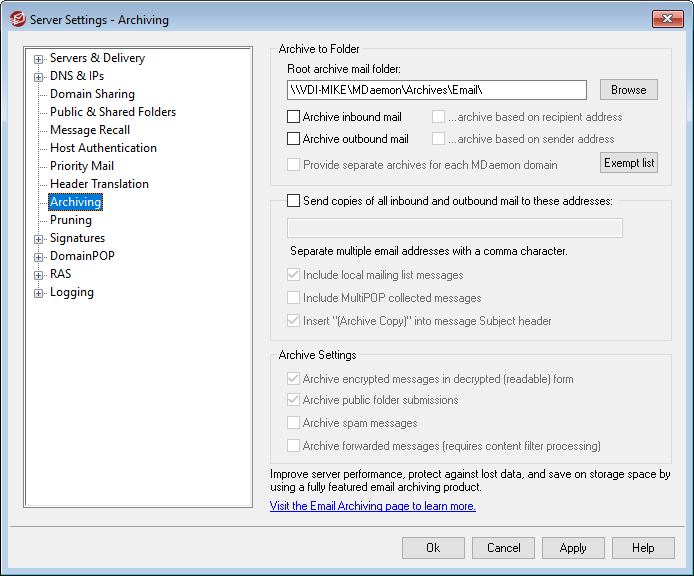 Use this feature to archive all inbound or outbound messages to a folder. The default location for this folder is C:\MDaemon\Archives\Email\, but you can set it to any folder you choose. You can choose to archive inbound messages addressed to your local users, outbound messages from your local users, or both. Mailing list traffic, messages being relayed, system-level messages, and autoresponders are never archived. Neither are spam messages or messages with viruses.