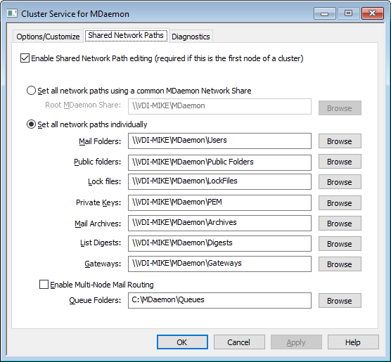 Use the options on this screen to set the shared network paths that will be used by the MDaemon cluster. This is required on the first node of the cluster so that the shared network paths can be replicated on the other nodes.
