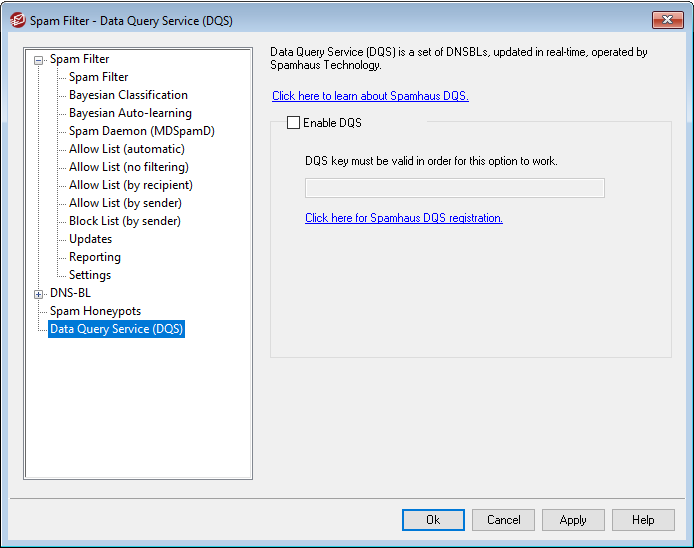 Data Query Service (DQS) is a set of DNSBLs, updated in real-time and operated by Spamhaus Technology in order to block over 99% of email-borne threats. DQS requires a valid subscription and usage key provided by Spamhaus Technology. To use the DQS service:
