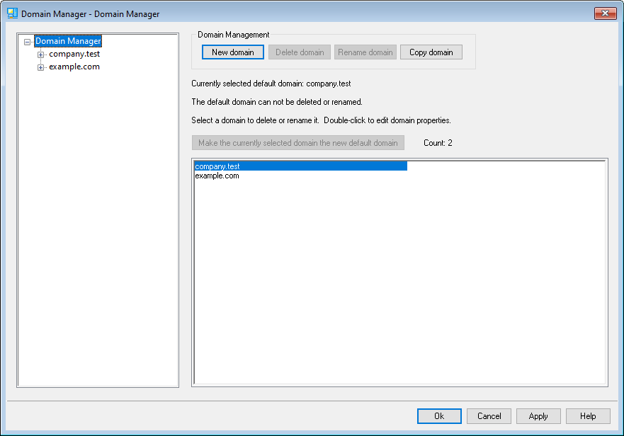 MDaemon contains full support for multiple domains, administered using the Domain Manager. Here you can manager the domain names, IP addresses, account and message pruning settings, Webmail settings, and other domain-specific options for your domains.