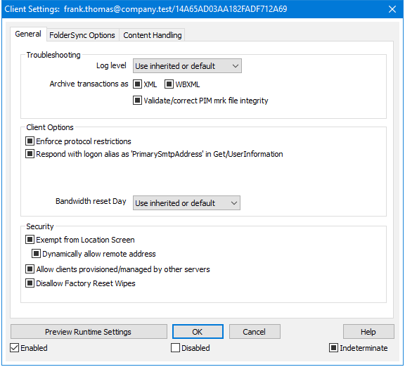 Archive transactions as [XML | WBXML] Use the Archive XML... and WBXML options if you wish to save this data, which can sometimes be useful for debugging purposes. The global options are disabled by default. Validate/correct PIM mrk file integrity This option runs a validation and correction process on the client's PIM data to look for known issues that could prevent it from syncing correctly, such as duplicate iCal UIDs or empty required fields. The global option is disabled by default. Client Options Enforce protocol restrictions Enable this option if you wish to deny connections from any client that attempts to use a protocol other than the the Allowed Protocol Versions specified for the client. By default this option is disabled, which means that protocol restrictions do not prevent a client from using a different protocol; they simply tell the client which protocols to use. If a client attempts to use a restricted protocol anyway, MDaemon will still allow the connection. See: Protocol Restrictions for more information. Respond with logon alias as 'PrimarySmtpAddress' in Get/UserInformation This allows the service to return an alias/secondary address as the primary address in response to a Settings/Get/UserInformation request. This works around an issue caused by a post iOS9.x update that resulted in clients not being able to send mail using an alias. Using this option results in a non-specification compliant response to Settings/Get/UserInformation. New clients require administrative approval Enable this option if you wish to require new clients to be authorized by an administrator before they can begin synchronizing with an account. The Clients list indicates any clients awaiting authorization, and the administrator can authorize them from the same screen. This setting it is Off by default. Max clients per user If you wish to limit the number of ActiveSync clients or devices that can be associated with an MDaemon account, specify the desired number in this option. The global option is set to "unlimited" by default. This option is available on the Global, Domain, and Account client settings screens, not the individual Clients screens. Bandwidth reset day Use this option if you wish to reset the bandwidth usage statistics for ActiveSync devices on a specific day of each month. The reset event takes place as part of the normal nightly maintenance process and is logged to the System log like other maintenance routines. The global option is set to "0 (Never)" by default, meaning the usage stats will never be reset. Set the child options to a different day if, for example, you want the reset day to coincide with a user or client's wireless carrier billing reset date. Security Exempt from Location Screen Enable this option on an ActiveSync client's settings screen if you want the device to be able to bypass Location Screening. This makes it possible for a valid user to continue to access his or her account via ActiveSync when, for example, traveling to a location that is otherwise blocked from authentication attempts. In order to exempt the device it must have connected and authenticated using ActiveSync within the time-frame configured in the Remove inactive clients after this many days setting located on the Tuning screen. Dynamically allow remote address When exempting a device from Location Screening, enable this option if you also wish to allow the remote IP address from which it is connecting. This can be useful for allowing other clients that might be connecting from the same IP address. Allow clients provisioned/managed by other servers By default, when the ActiveSync server sends provisioning data/policy specifics to a client and it reports that it is also managed by another ActiveSync server, the client will still be allowed to connect to MDaemon. In this circumstance, however, there is no way to ensure that your policy specifics will be applied where they conflict with the other ActiveSync server's policy. Generally clients default to using the most restrictive option where policies conflict. Disable this option if you do not wish to allows those clients to connect. Disallow Factory Reset Wipes If set to On/Yes, the ability to Full Wipe an ActiveSync Client will not be available. If you wish to be able to do a full remote wipe on a client, you must first disable this option. The option is disabled by default. For more information, see: Full Wiping an ActiveSync Client on the Clients page.