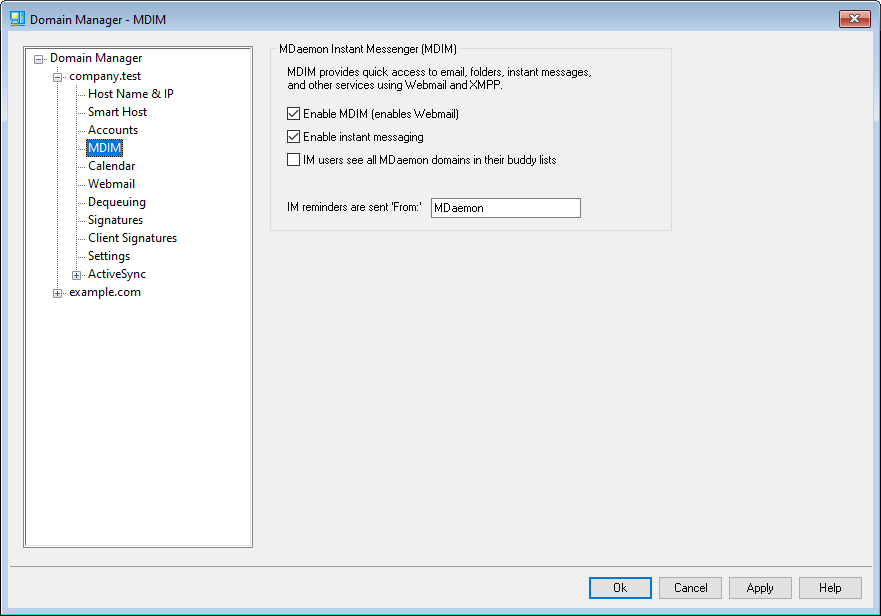 This screen controls various aspects of MDaemon Instant Messenger (MDIM) for this domain. The initial settings on this screen are determined by the Default MDaemon Instant Messenger settings located on the Web & IM Services dialog. MDIM services can be enabled or disabled for specific accounts or groups via the Web Services and Group Properties screens respectively.